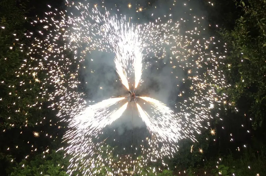 Профессиональные огненные вертушки из сценических фонтанов монтируются на любой выделенной вам площадке для наземного фейерверк шоу. С помощью фонтанов, такие изделия создают множество искр в динамике кругового вращения пиротехнического элемента – конструкции